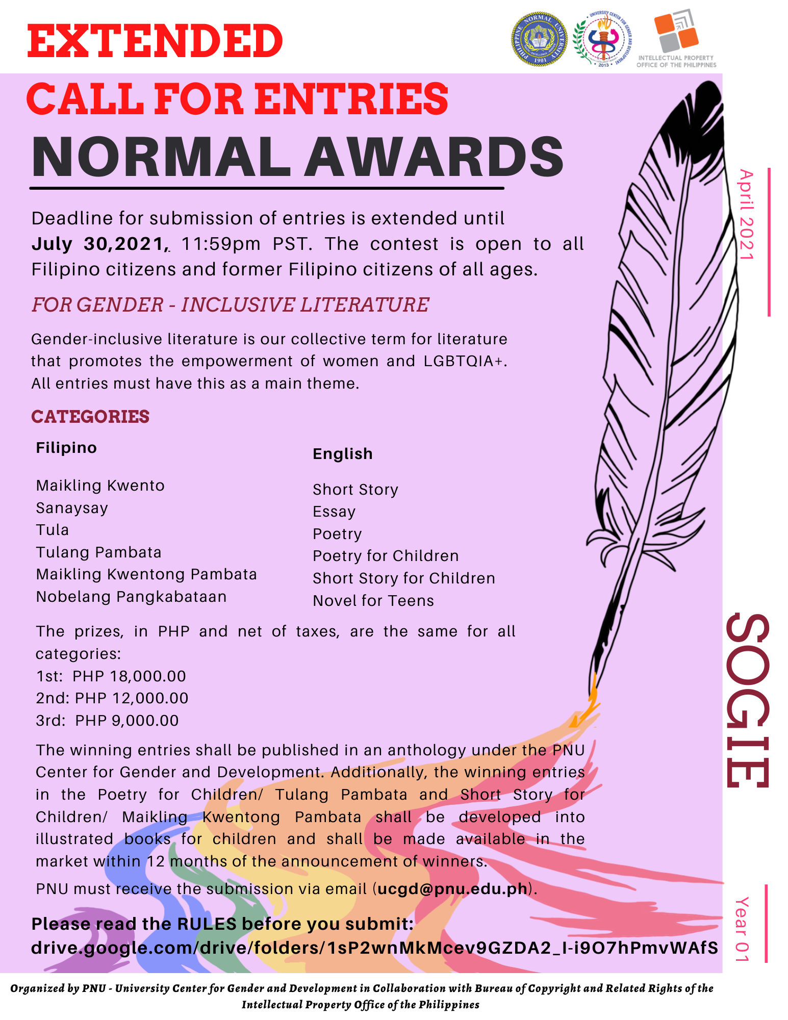 Coinciding with the Pride Month Celebration, the Philippine Normal University, through the University Center for Gender and Development (UCGD), is pleased to announce the call for entries of the inaugural Normal Awards. The said award aims to promote women and LGBTQIA+ empowerment through literature.