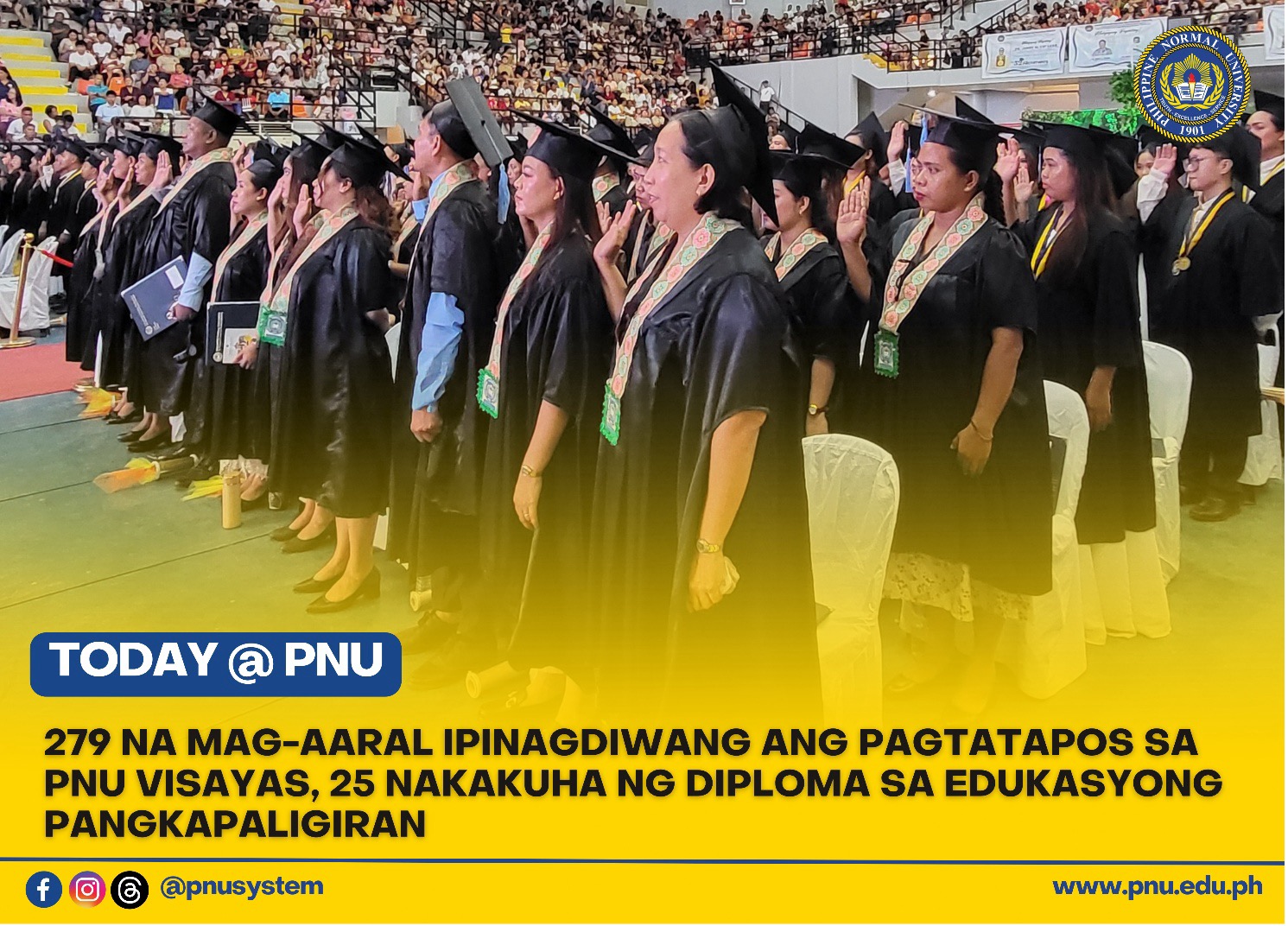Ipinagdiwang ng komunidad ng PNU Visayas ang maluwalhating pagtatapos ng 279 na mag-aaral sa naganap na ika-52 Seremonya ng Pagtatapos na idinaos kahapon, ika-5 ng Agosto 2025, sa Cadiz City Arena, Lungsod ng Cadiz, Negros Occidental. Ang Seremonya ng Pagtatapos ay may temang “Hinubog na Kahusayan: Ang Panibagong Landas ng PNU sa Edukasyong Pangguro”. Sa bilang na ito, 254 ang mula sa antas di-gradwado at 25 naman ang mula sa programang post baccalaureate na Diploma in Environment and Green Technology Education. Mula sa bilang ng mga nagtapos sa antas di-gradwado, 161 ang nagkamit ng karangalang Magna Cum Laude at 71 naman ang Cum Laude.