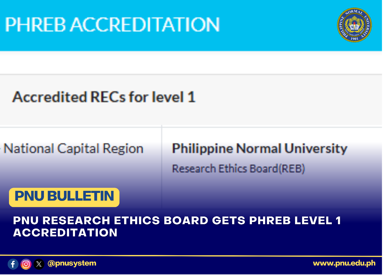 The Philippine Normal University (PNU) proudly announces that its Research Ethics Board (REB) has successfully achieved Level 1 accreditation from the Philippine Health Research Ethics Board (PHREB) as of April…