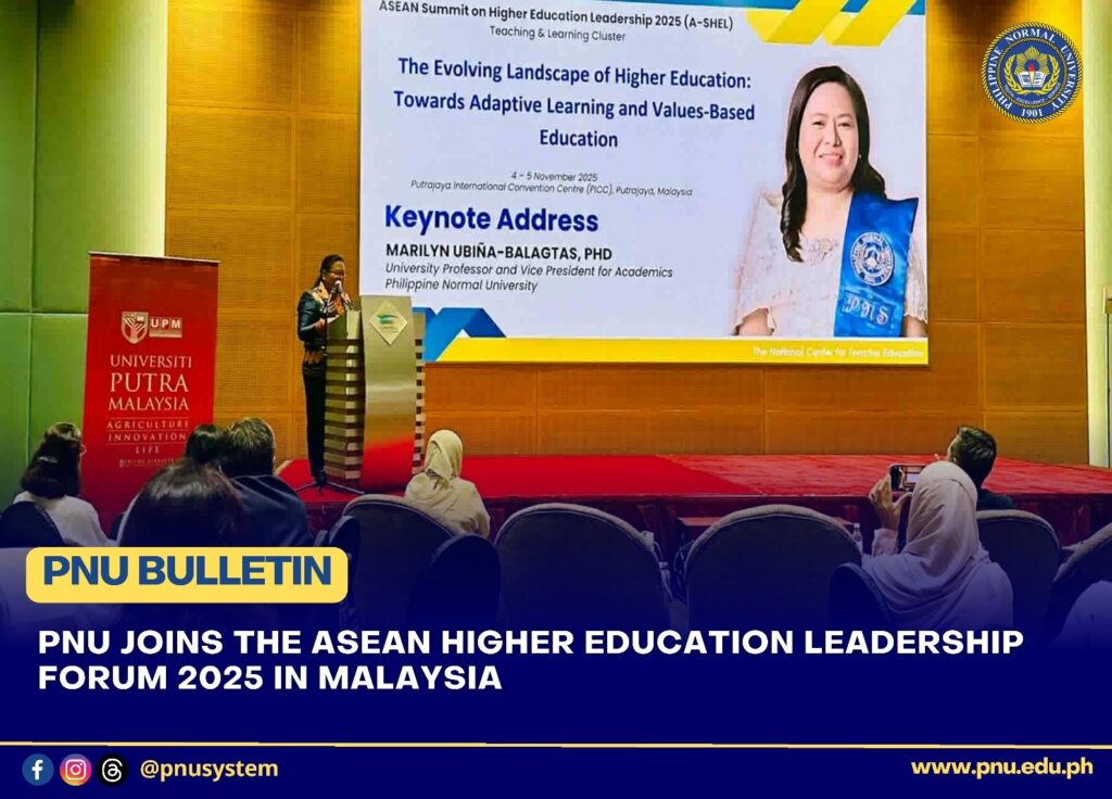 The Philippine Normal University (PNU) participated in the ASEAN Higher Education Leadership Forum (ASHELF) 2025 organized by the Ministry of Higher Education Malaysia and the Sultan Idris Education University (UPSI), with the leadership of the University of Putra Malaysia (UPM). This forum was held at the Putrajaya International Convention Centre (PICC) in Malaysia from November 4 to 5, 2025, as part of the Festival of Ideas (FOI) organized by the Government of Malaysia, being the Chair of the ASEAN Summit 2025.