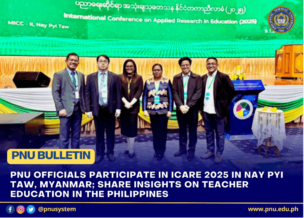 The International Conference on Applied Research in Education (ICARE) 2025, held in Nay Pyi Taw, Myanmar, from January 9 to 10, 2025, brought together educators, researchers, and policymakers to explore innovative solutions in education, science, and technology. Among the participants were officials from the Philippine Normal University (PNU), namely Vice President for Academic Affairs Dr. Marilyn U. Balagtas, ASEAN Teacher Education Network (AsTEN) Executive Director Prof. John Carlo M. Ramos, and Linkages and International Office Director Prof. Bryan C. Dayuta.