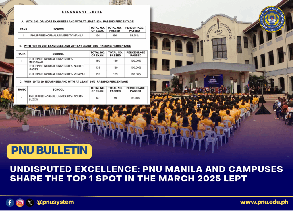 This reason became once more apparent in the results of the March 2025 Licensure Examination for Professional Teachers released by the Professional Regulation Commission on May 23, 2025, where PNU emerges supreme from hundreds of teacher education institutions, retaining the top spot on the list of best-performing schools.