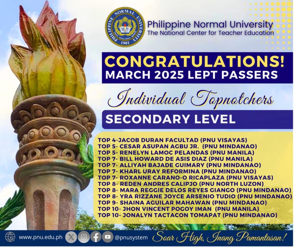 Fourteen PNUans from various campuses also made it onto the list of topnotchers for this examination. Mr. Jacob Duran Facultad from PNU Visayas led the group of top PNU performers at the secondary level, earning a 93.20% rate and securing the Top 4 position. Meanwhile, PNU South Luzon’s pride, Ms. Mary Rose Sanchez Macabuhay, is the only PNUan listed among the topnotchers for the elementary level, landing in the Top 10 with her passing rate of 92.60%.